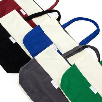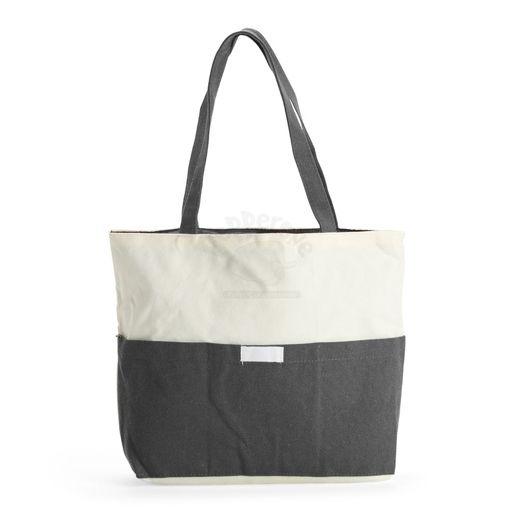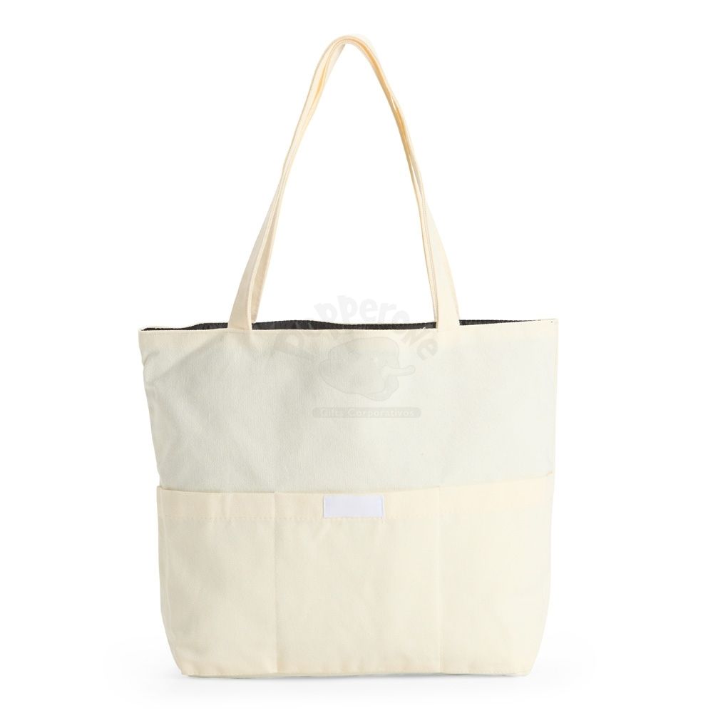 Sacola confeccionada em lona 356g/m² com revestimento interno em poliéster, bolso frontal aberto e duas alças com costura interna.