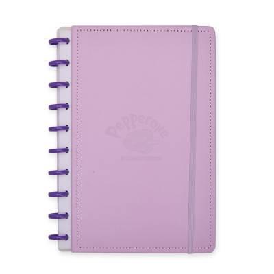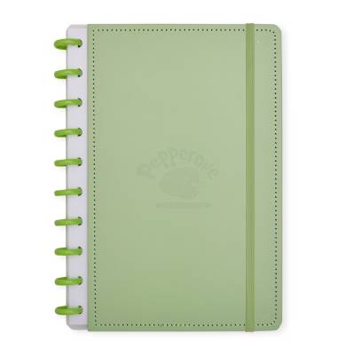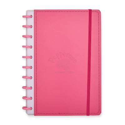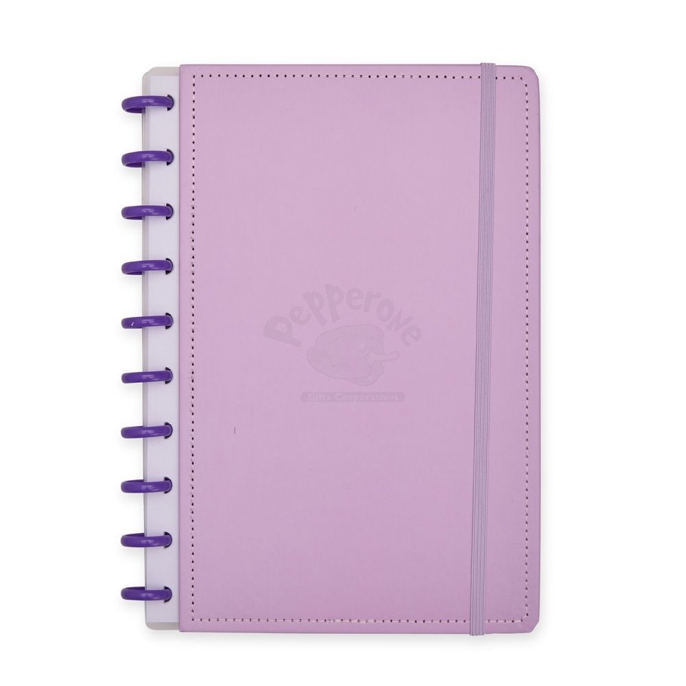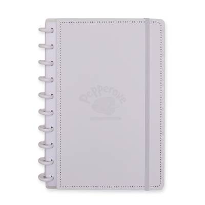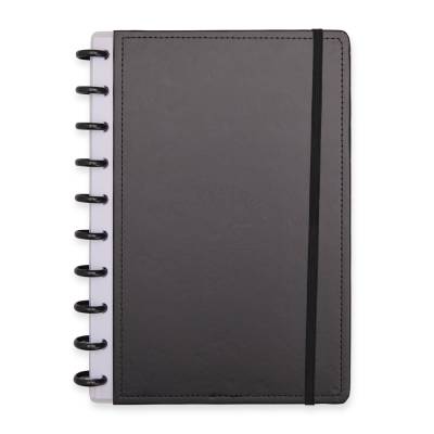 Caderno capa dura em papelão, com elástico para fechamento e encadernação em discos plásticos reposicionáveis, que permitem acrescentar ou remover folhas compatíveis com facilidade. Conta com aproximadamente 80 folhas brancas pautadas.