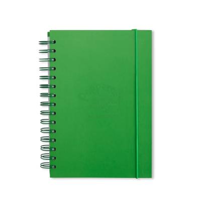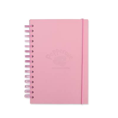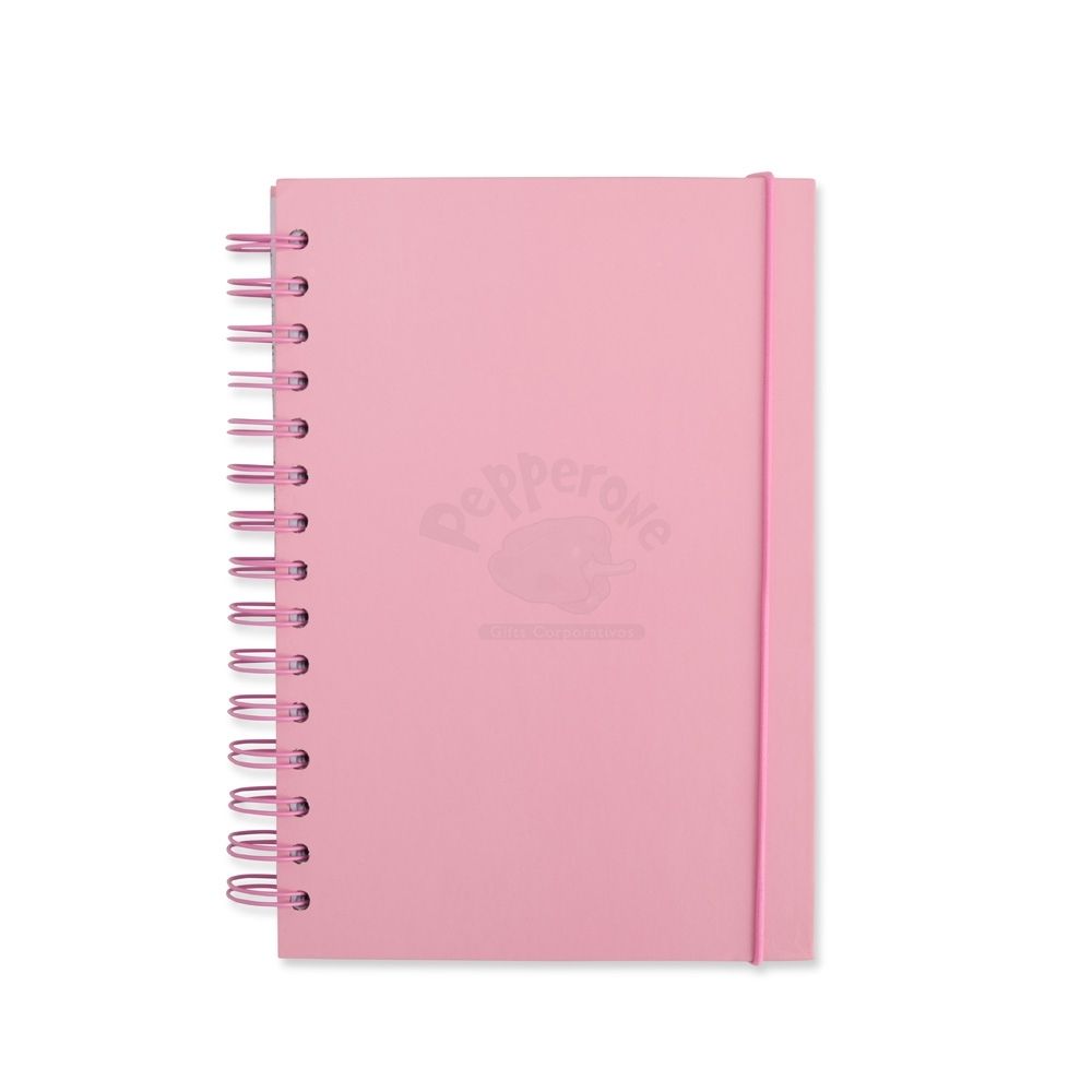 Caderno com capa dura em couchê, encadernação wire-o, marcador de páginas em fita de cetim e elástico para fechamento. Conta com aproximadamente 160 folhas brancas com pauta.