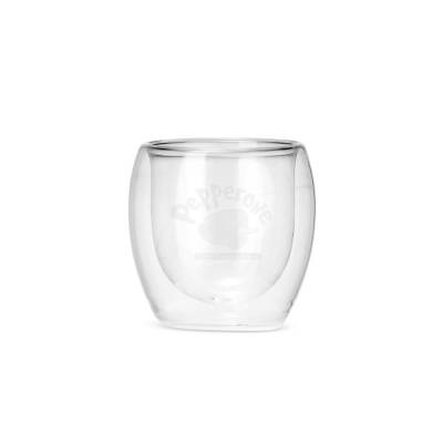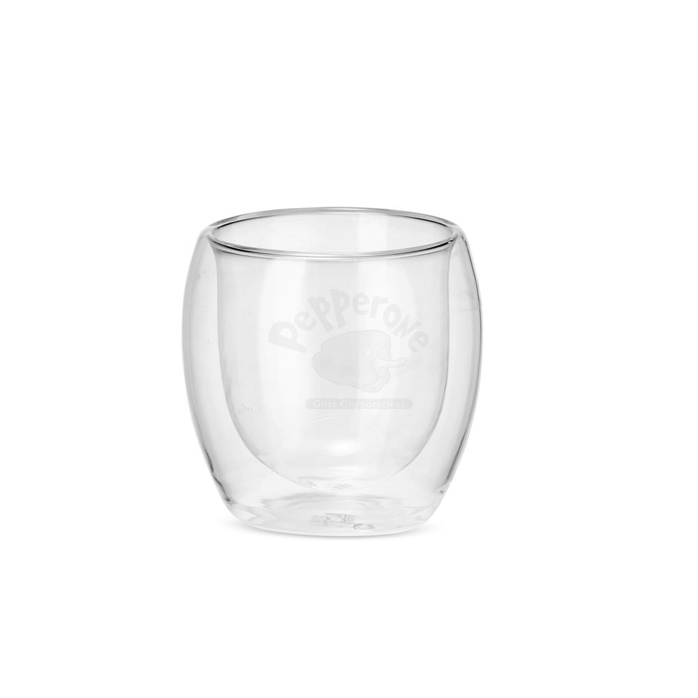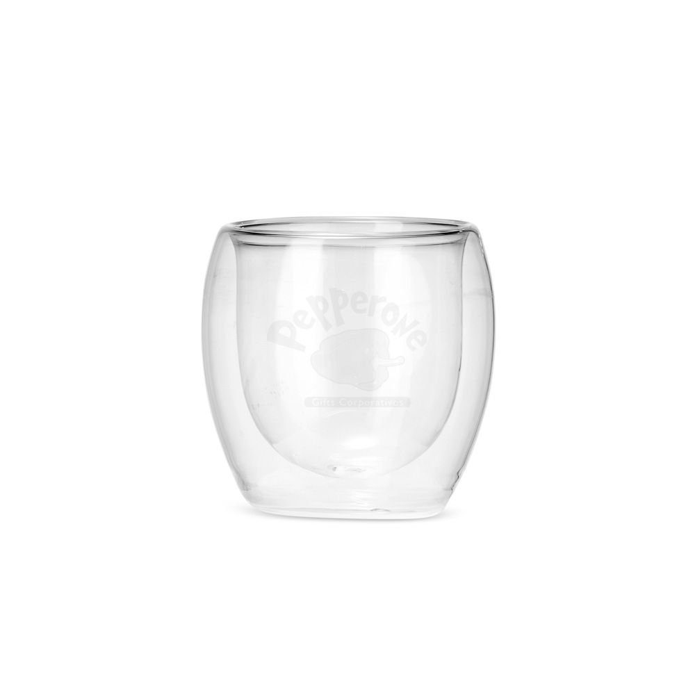 Copo de vidro borossilicado com capacidade máxima de 250ml e estrutura de parede dupla, que ajuda a impedir o contato direto entre a temperatura do líquido e a parede externa da caneca.