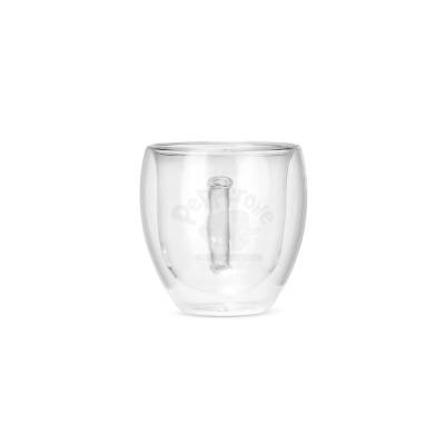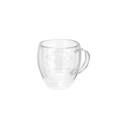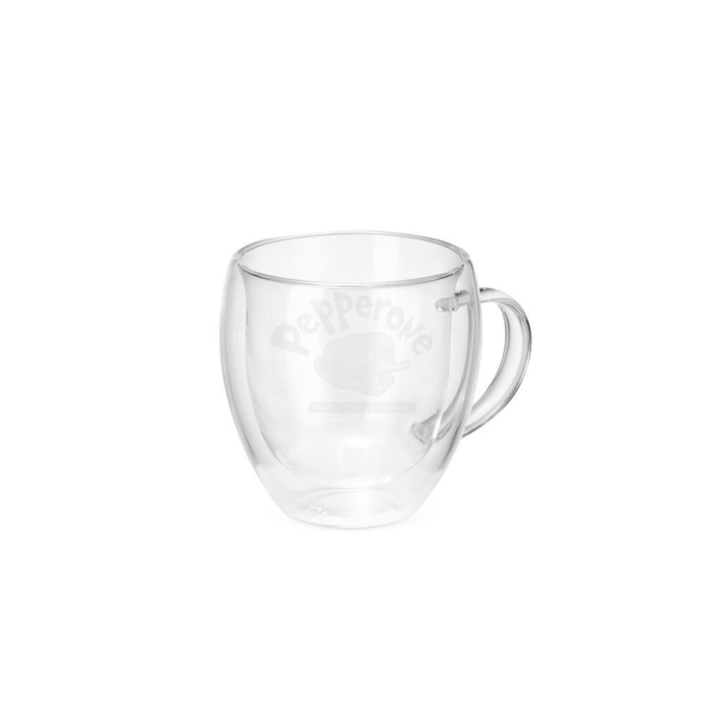 Caneca de vidro borossilicado com capacidade para até 150ml e estrutura de parede dupla, que ajuda a impedir o contato direto entre a temperatura do líquido e a parede externa da caneca.