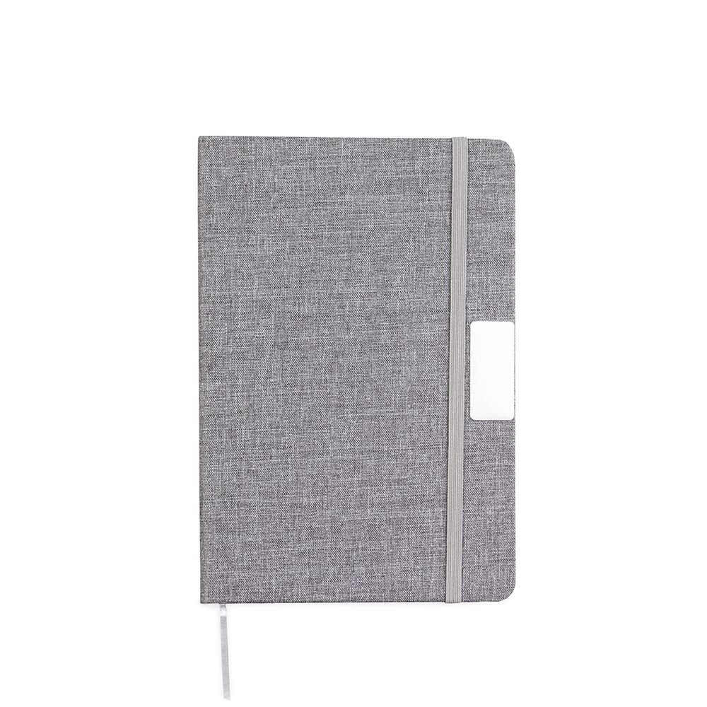 Caderneta em capa com acabamento em tecido de algodão, plaquinha metálica personalizável, elástico para fechamento, marca-páginas em fita de cetim e aproximadamente 96 folhas marfim pautadas.
