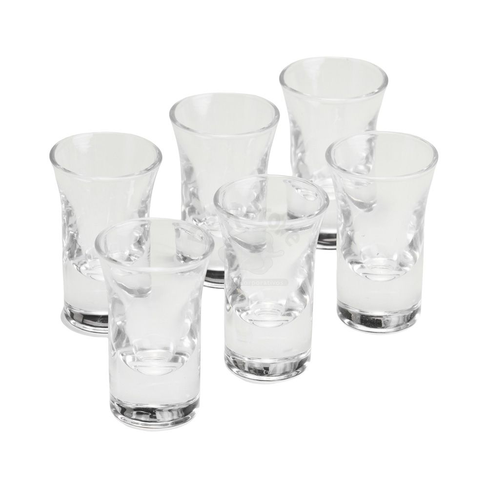 Kit com seis copos de vidro com capacidade máxima de 30ml cada.
