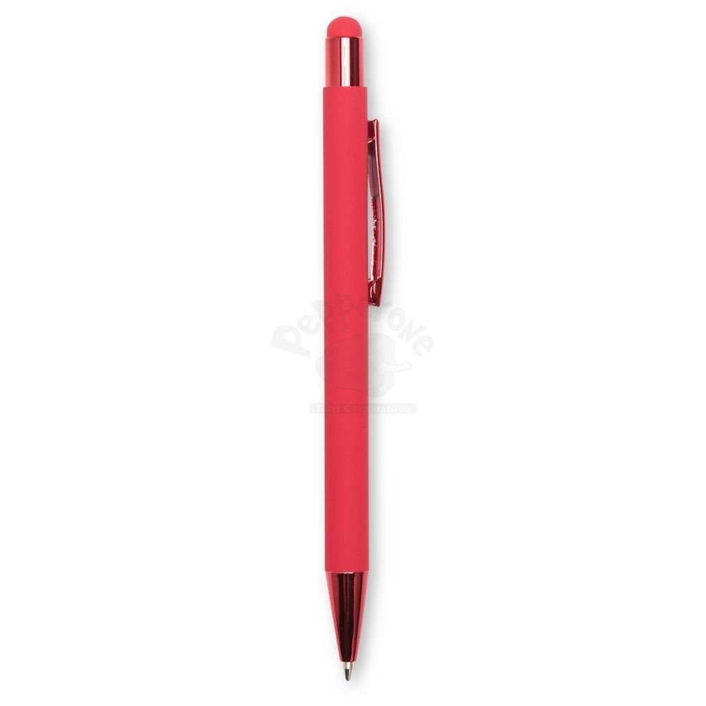 Kit executivo com duas peças, composto por uma caderneta de capa em couro sintético com fechamento magnético e cerca de 80 folhas pautadas, e uma caneta em metal com detalhes em plástico, ponteira emborrachada para uso em dispositivos touchscreen e carga esferográfica azul de 1,0 mm. Acompanha uma caixa de papelão com berço em espuma para a caneta.