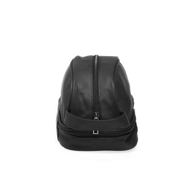 Nécessaire confeccionada em couro sintético impermeável. Possui alça lateral de mão e dois compartimentos com fechamento em zíper: o principal, na parte superior, e outro na parte inferior, ideal para guardar itens úmidos.