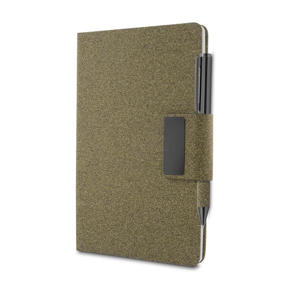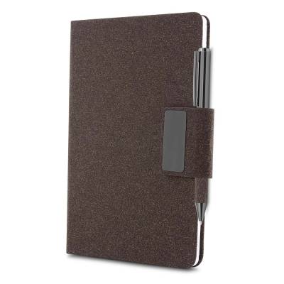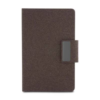 Caderno de anotações com capa em PU e fibra de chá ou café, 80 folhas 70 g/m², engate para caneta com fechamento magnético e placa de metal, não acompanha caneta.