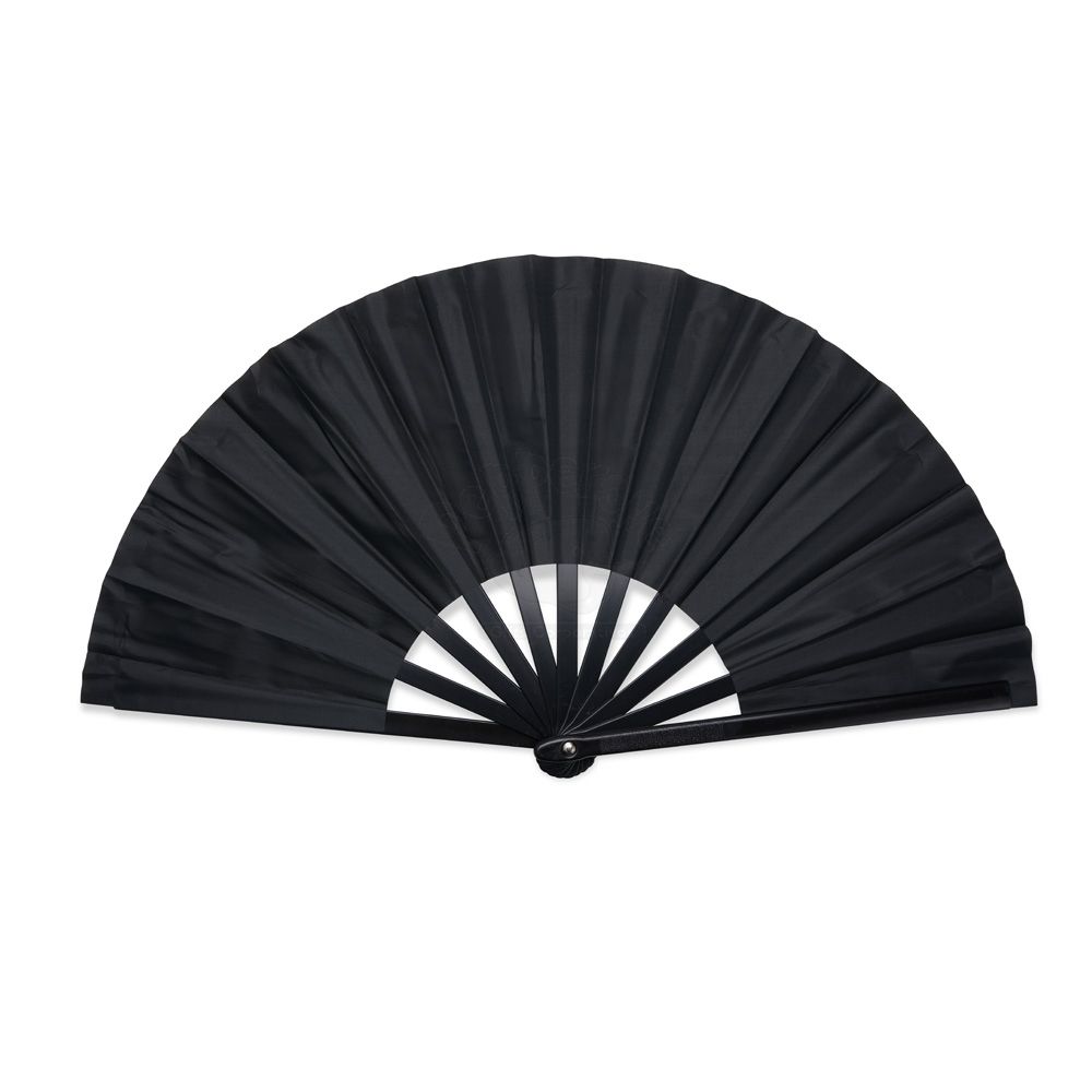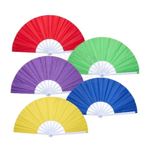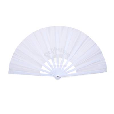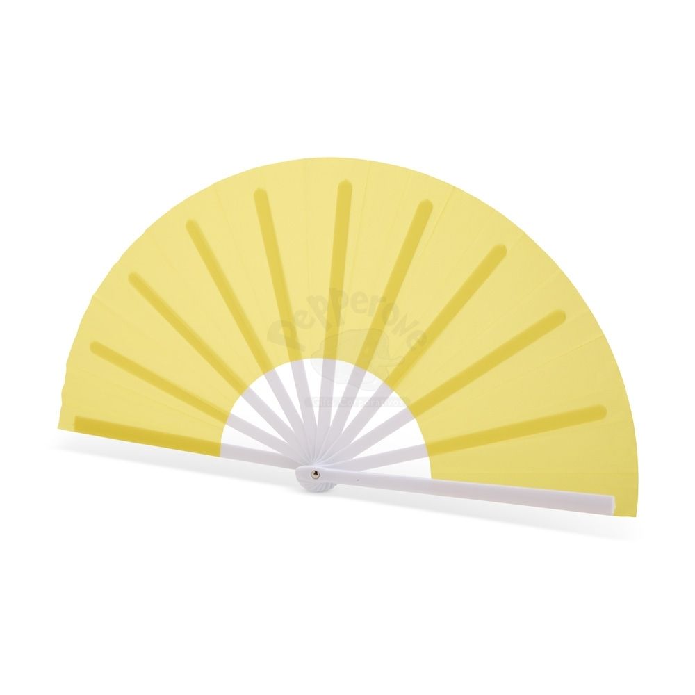 Leque com estrutura resistente em plástico e tecido em tafetá.